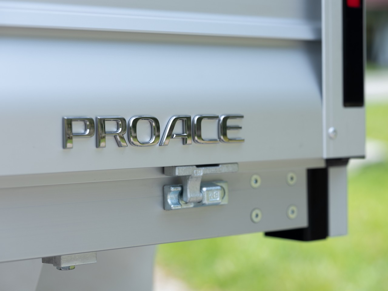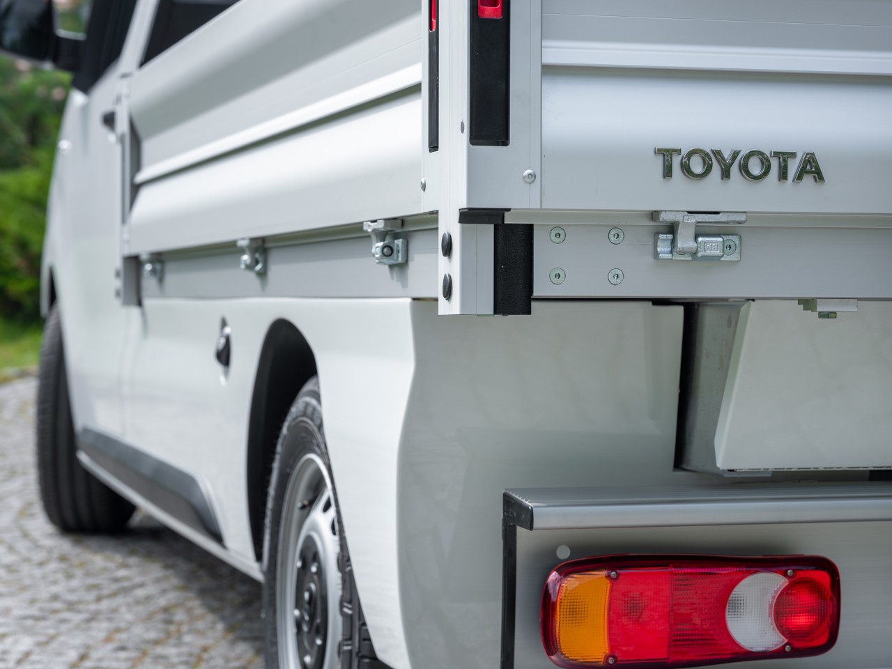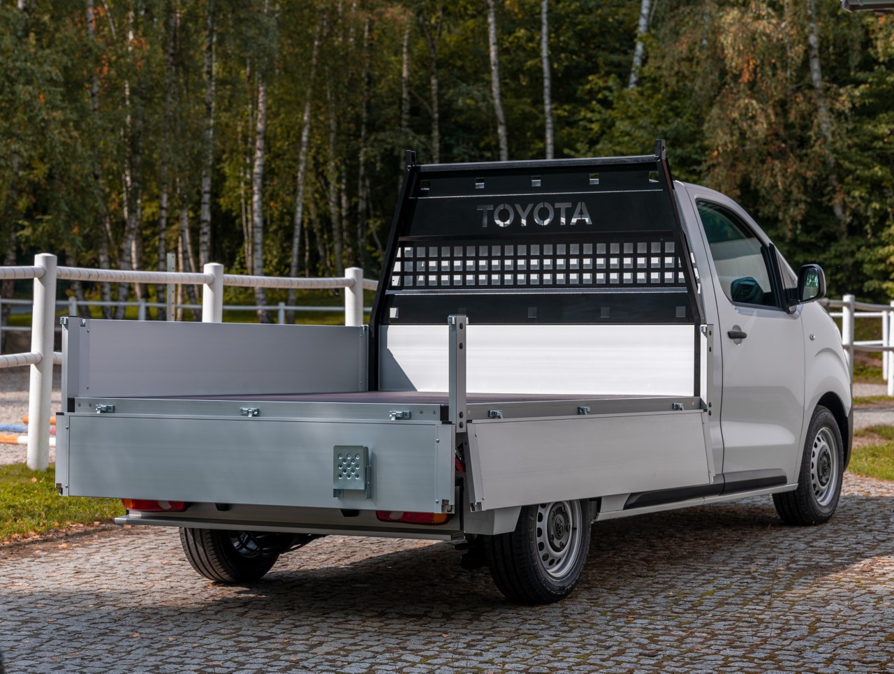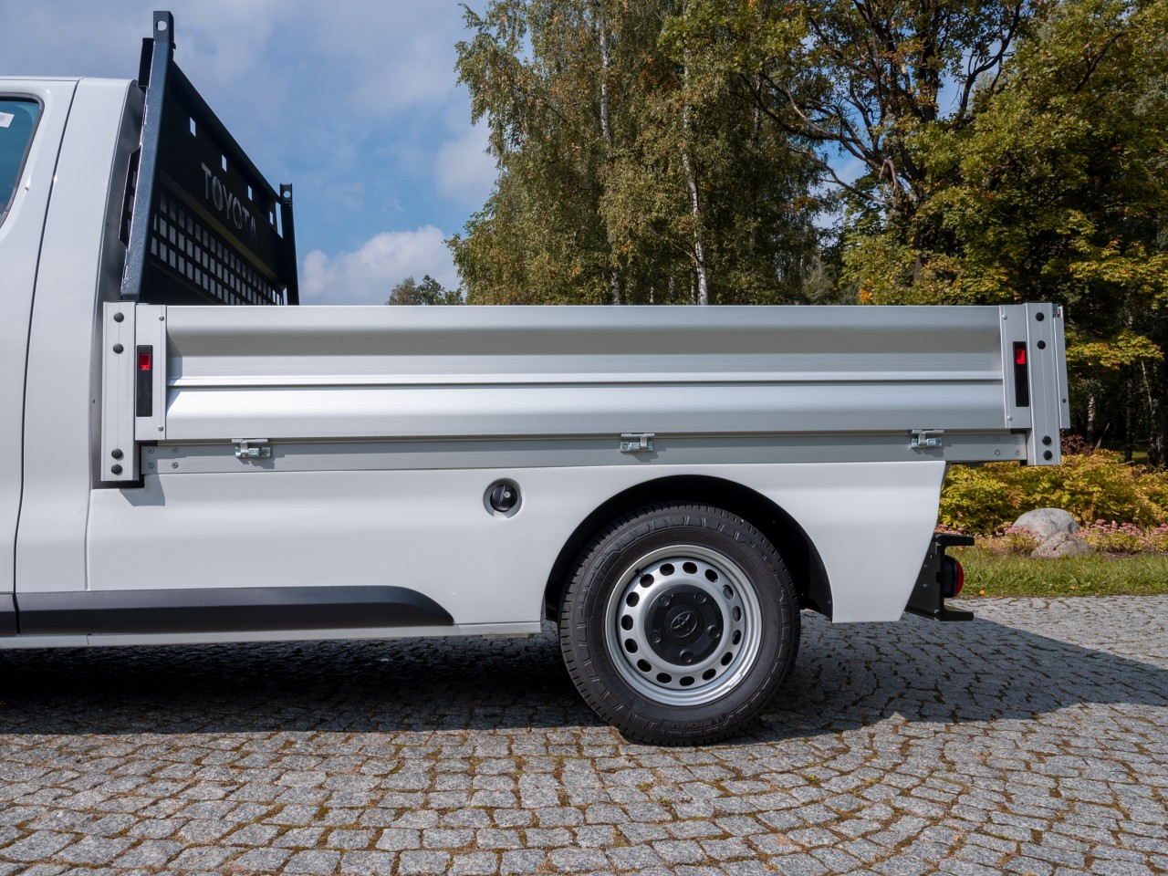 Skrzynia ładunkowa Toyoty PROACE Platforma posiada lekką aluminiową konstrukcję, co wpływa także na niższą wagę całej zabudowy. Podłoga jest wykonana z wodoodpornej sklejki o grubości 15 mm z warstwą antypoślizgową, a burty o wysokości 350 mm są wyposażone w zamki kasetowe zapobiegające samoczynnemu otwarciu.