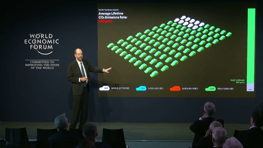 Chcąc lepiej zobrazować stanowisko Toyoty, Gill Pratt przedstawił porównanie trzech sposobów obniżenia emisyjności floty 100 samochodów spalinowych przy użyciu tej samej, ograniczonej liczby ogniw bateryjnych o łącznej pojemności 100 kWh. Taka liczba baterii nie wystarczy oczywiście do elektryfikacji wszystkich 100 samochodów. Dlatego bez względu na to, czy włączymy do floty samochody elektryczne, hybrydy plug-in czy hybrydy, w każdym z tych wariantów zawsze część z pojazdów zostanie wymieniona na nowe auta z konwencjonalnym silnikiem.