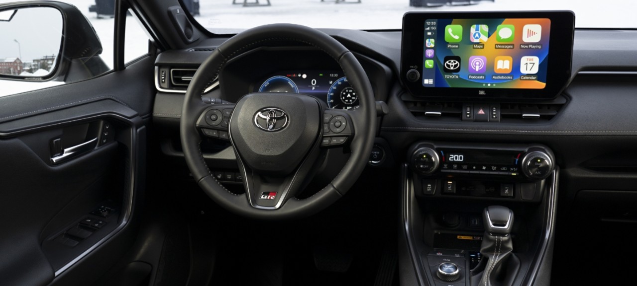 RAV4 GR SPORT został wyposażony w system multimedialny Toyota Smart Connect® z kolorowym ekranem dotykowym (10,5" HD). Stałe, oparte na ikonach menu jest prezentowane na wyświetlaczu po stronie kierowcy. Użytkownicy mogą również podłączyć do systemu swój smartfon lub tablet za pomocą interfejsów Apple CarPlay* lub Android Auto™.