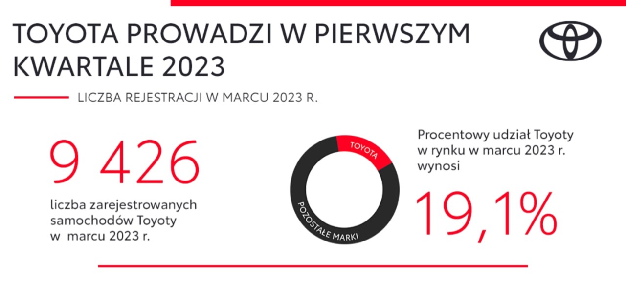 • Pierwszy kwartał 2023 roku Toyota zakończyła jako lider polskiego rynku motoryzacyjnego. W tym czasie zarejestrowano 26 139 aut osobowych marki (ponad 2 razy więcej niż w przypadku marki zajmującej drugie miejsce w zestawieniu). Udział Toyoty w rynku samochodów osobowych wzrósł do 21,2% (+3,1 p.p. w porównaniu z analogicznym okresem 2022 roku).
