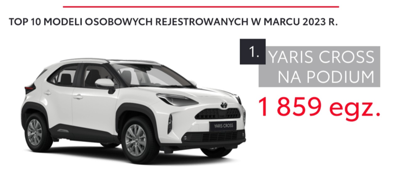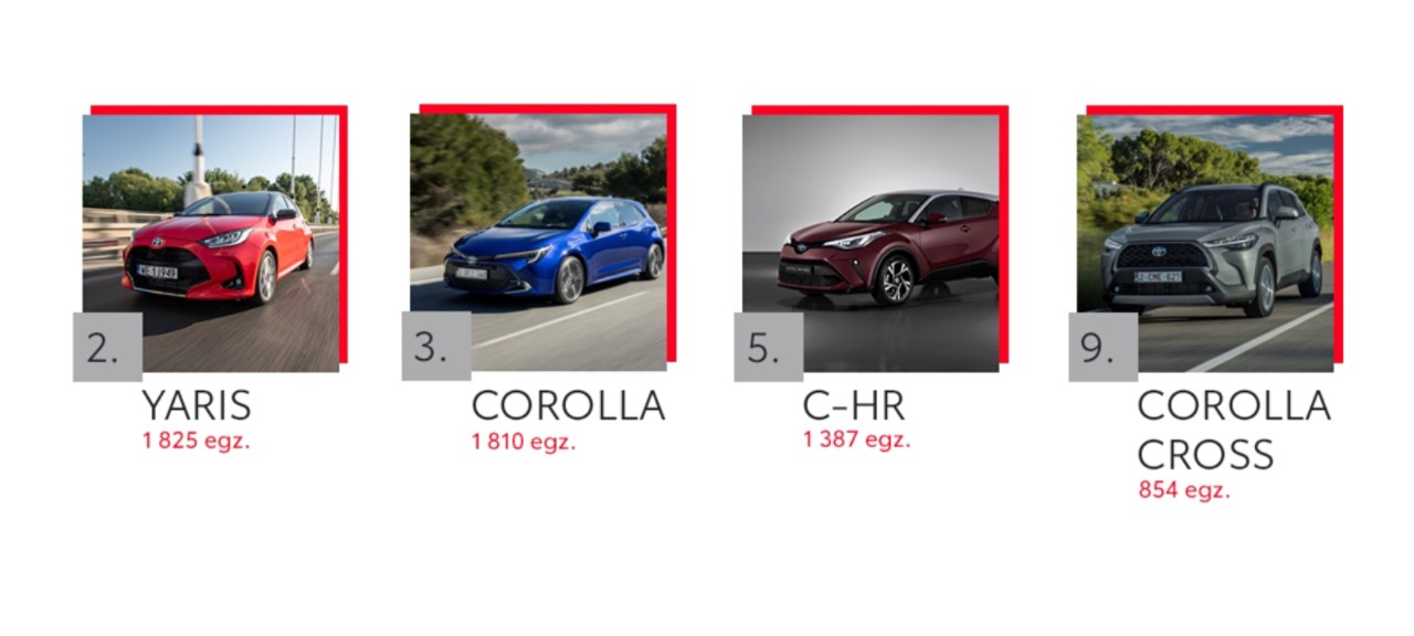 W dziesiątce najpopularniejszych samochodów osobowych znalazło się aż sześć modeli Toyoty. Pojazdy marki zajęły całe podium – na pierwszym miejscu uplasował się Yaris (5365 egz.), drugą pozycję zajął Yaris Cross (5210 egz.), a trzecią – Corolla (4998 egz.). Toyota C-HR w zestawieniu zajęła piąte miejsce (3216 egz.), Corolla Cross – ósme (2331 egz.), a RAV4 – dziewiąte (2125 egz.).