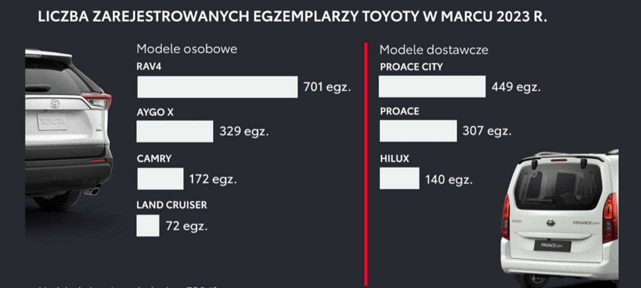 W pierwszym kwartale 2023 roku w Polsce zarejestrowano 26 139 samochodów osobowych Toyoty. Udział japońskiej marki w rynku aut osobowych wzrósł do 21,2%. Największą popularnością na polskim rynku cieszyły się takie modele, jak Yaris, Yaris Cross i Corolla (zarówno wśród klientów indywidualnych, jak i firmowych). Silną pozycję na rynku miały też modele użytkowe marki, a PROACE CITY utrzymał pozycję lidera segmentu.