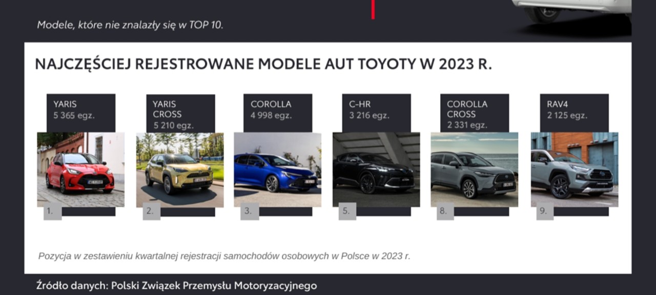 Cztery modele osobowe Toyoty zajęły też pierwsze miejsca w swoich segmentach – są to Yaris, Yaris Cross, Corolla oraz Toyota C-HR, której na drugim miejscu towarzyszy Corolla Cross. Aygo X w pierwszym kwartale zarejestrowano w liczbie 1030 egz., a RAV4 – 2125 egz., co zapewniło tym modelom drugie miejsce w segmentach.